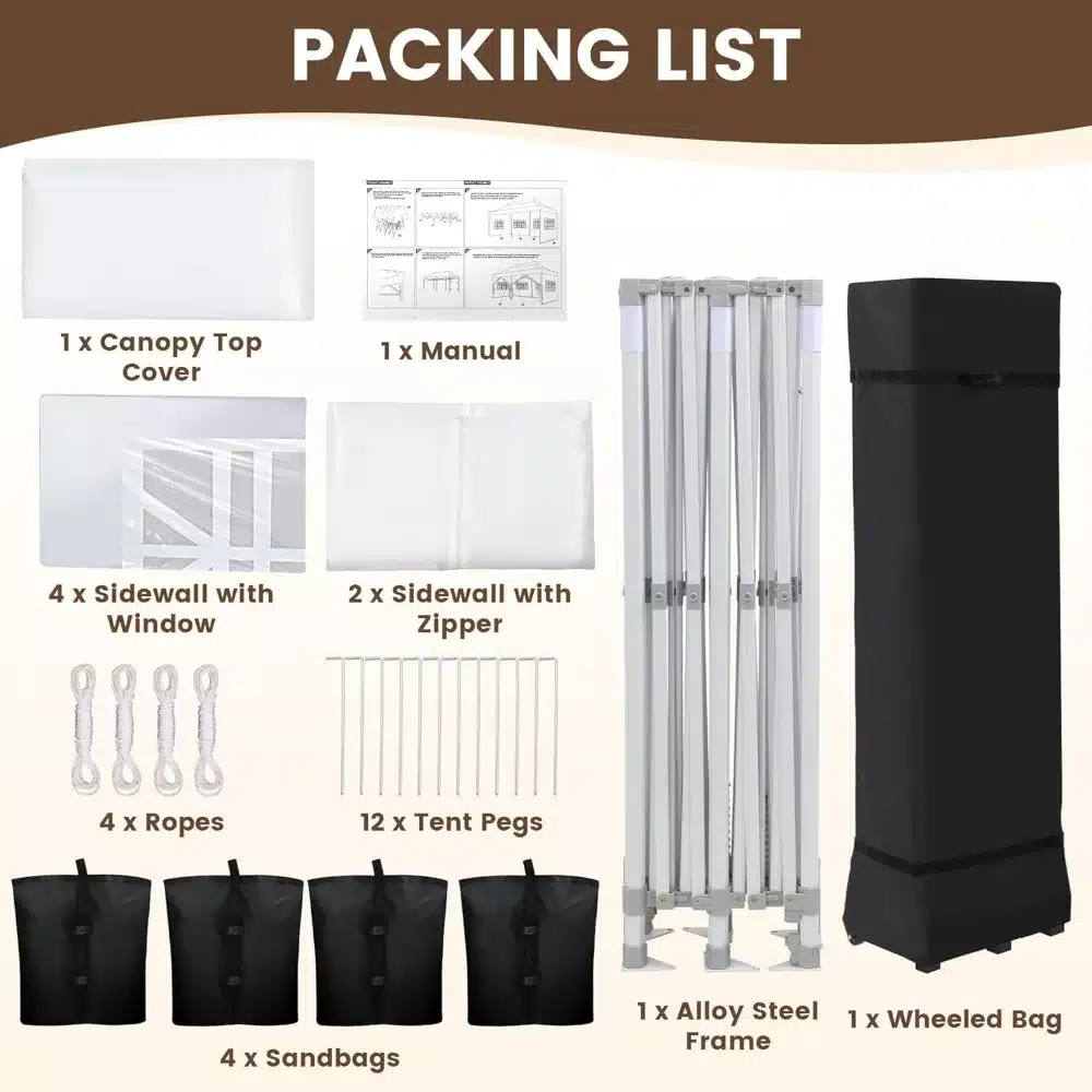 - EXTRA ITEMS INCLUDED Every pop up canopy tent includes a storage bag with all terrain wheels. The bag also makes storage easy and convenient with a minimum of space required. We also include 4 large sandbags which will help you secure the corners in the event of a windy day. Additionally, all our pop up canopy tents include 12 heavy duty ground stakes for additional safety, as well as 4 tie-down ropes for the corners